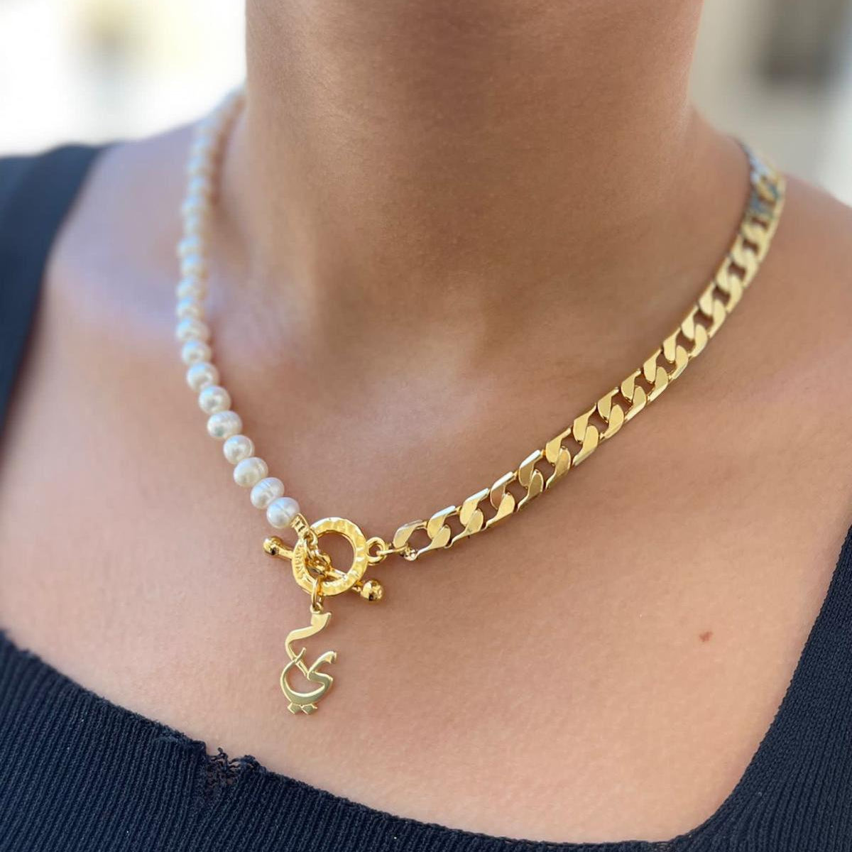 • مزيج أنيق من السلسلة الذهبية، اللؤلؤ، والعناصر المطروقة