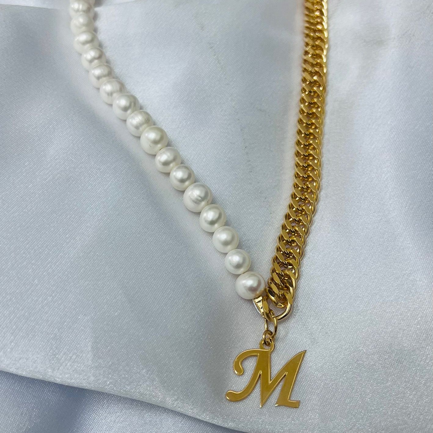 • مزيج أنيق من السلسلة الذهبية، اللؤلؤ، والعناصر المطروقة