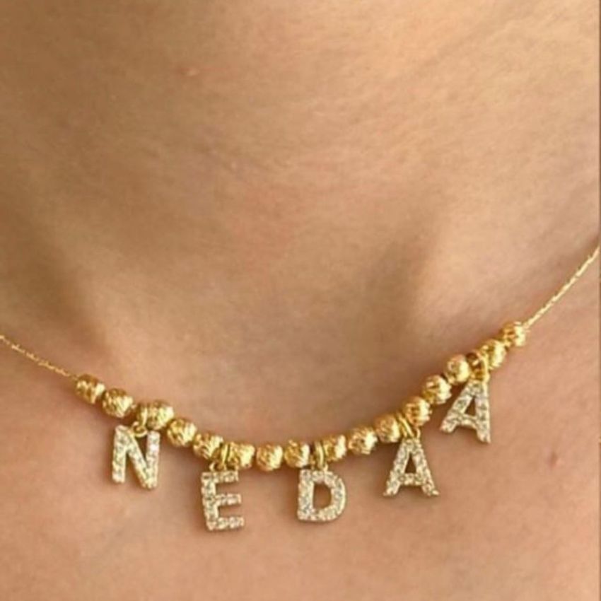 سنسال اسم مطلي بالذهب بتصميم أنيق وعصري، مزين بأحرف مرصعة بحجر الزركون اللامع، يمنحك مظهرًا فاخرًا ولمسة شخصية مميزة.