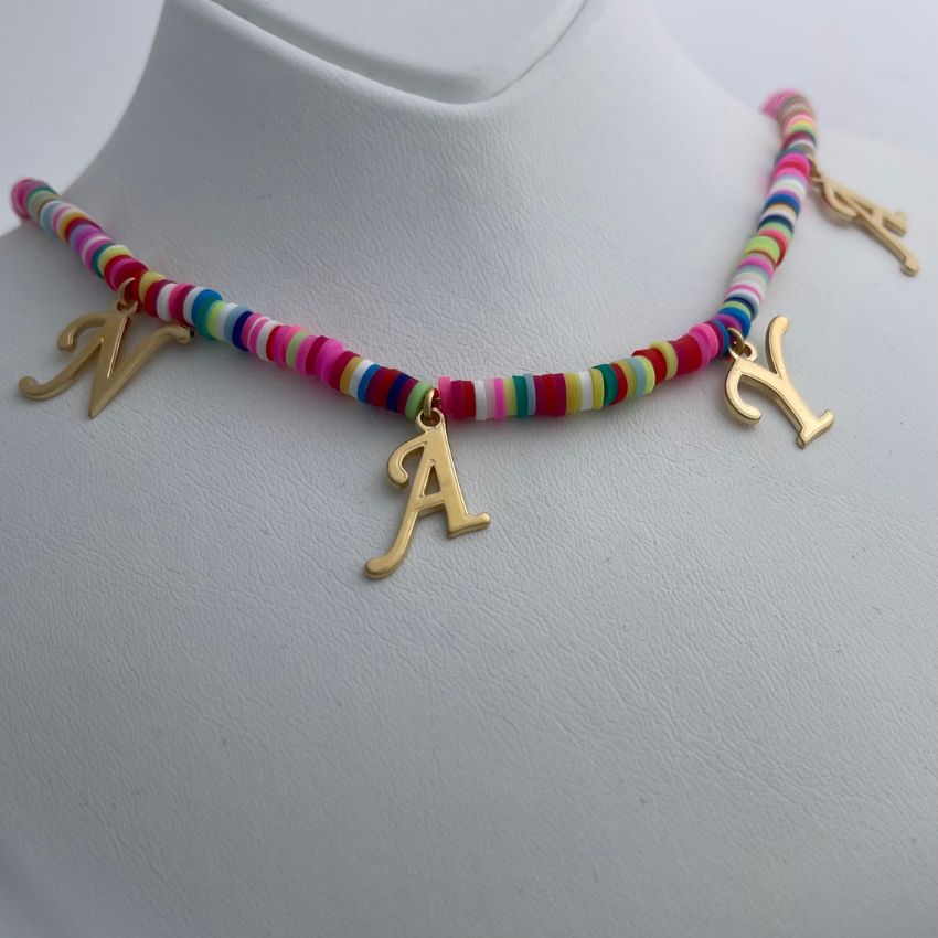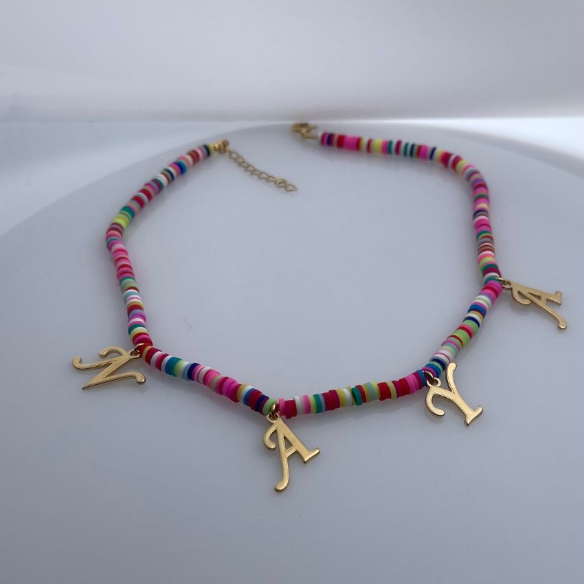 قلادة تجمع بين المرح والأناقة والمعنى الشخصي، صُممت لتكون قطعة مبهجة تعبّر عن الاسم بأسلوب عصري وملوّن 💖