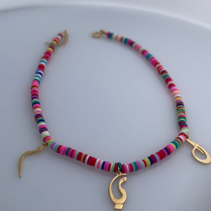 قلادة أحرف مميزة بتصميم مرح وعصري، مصنوعة من خرز ملوّن بألوان زاهية مع تعليقات أحرف مطلية بالذهب تضيف لمسة أنيقة ومبهجة في آنٍ واحد. يمكن تخصيص القلادة بحرف واحد أو عدة أحرف حسب الرغبة، لتعبّر عن الاسم أو الأحرف المفضلة بطريقة مرحة وشخصية.