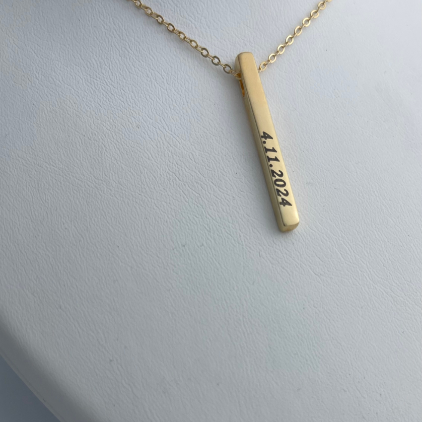 قلادة بار عمودية بتصميم مينيمال أنيق، مطلية بالذهب ومزينة بنقش تاريخ مخصص يحمل قيمة وذكرى لا تُنسى. يتميز التصميم بخط نظيف وبسيط يبرز النقش بدقة عالية، ليجعل القلادة قطعة شخصية راقية تناسب جميع الإطلالات.